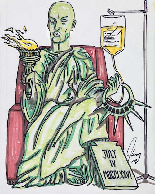 In The Great Spewdini, the caption reads, “Manafort, GUILTY! Cohen, GUILTY! Flynn, GUILTY! Gates, GUILTY! What’s happening to All the Best People? “Ladies and Gentlemen! Children of all ages! Can the Great Spewdini spew enough lies to escape the straight-jacket of his un-Presidented criminality?” Carrey has posed Trump as Harry Houdini, suspended upside down from a flagpole, arms constrained in a straightjacket, high above Times Square. Below him, a billboard for Death of a Salesman can be seen on a rooftop. With his hairpiece ready to fly off and his long, red tie blowing in the wind, Trump is clearly struggling. The concept of an escape artist is an apt one to convey the idea of a huckster caught up in his lies and Carrey exploits the comparison in a Jack Kirby inspired composition. The colorful, energetic and complex composition is effective, a case where his ambitious layout is rewarded.