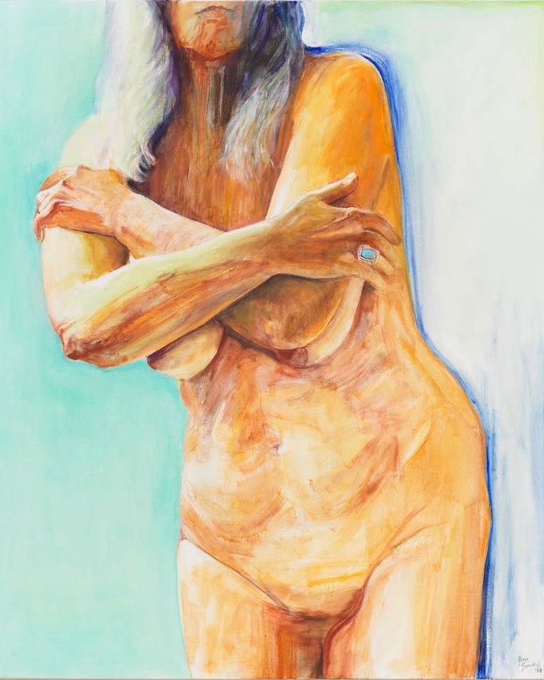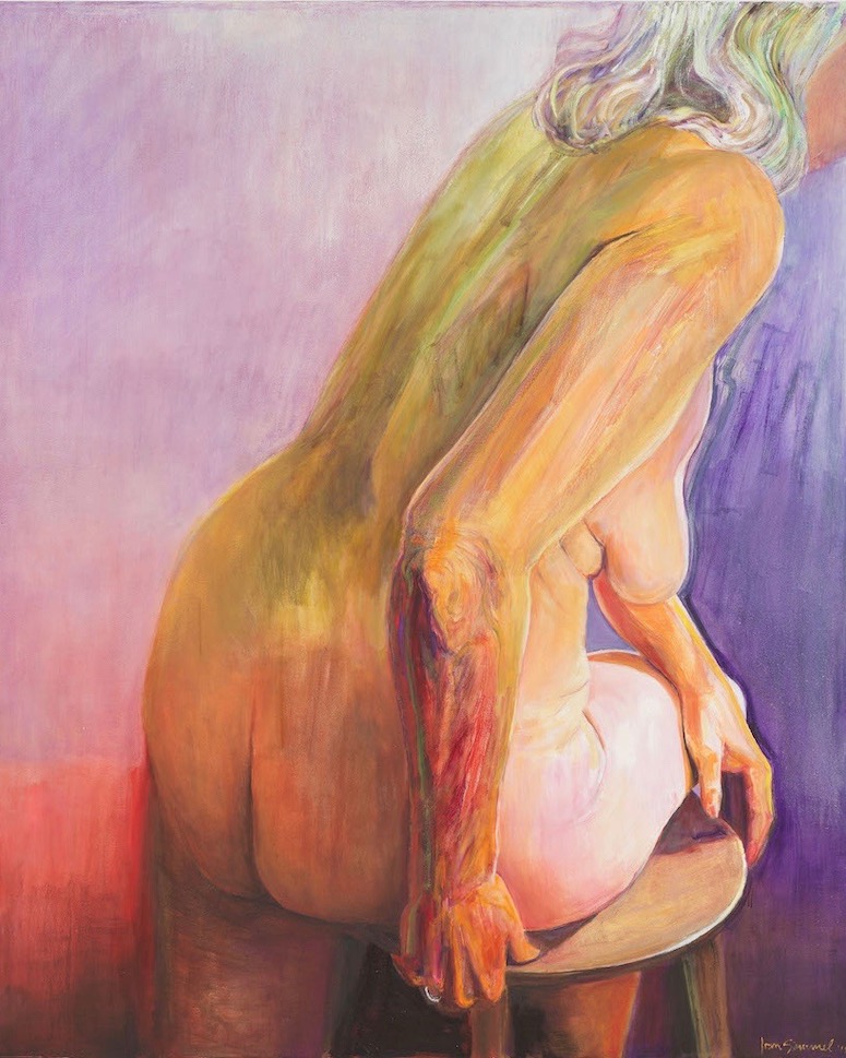 It is in sharp contrast to the relatively demure, almost coy, full-frontal standing figure in Crossed Arms (2018), her arms protectively covering her breasts, the background a delicate robin’s egg blue, although her skin retains a ravaged aspect. In Turning (2018), Semmel is perched on a stool, pivoting to the right; her back is shadowed with a jaundiced green against a glowing lavender background. And then there is Seated in Red (2018), a seemingly simple image of a shapely female back, oddly reminiscent of Man Ray’s Ingres’ Violin. The orange and purple-tinted skin of the upper back looks almost flayed, the background is a flaming crimson; this painting conveys the conflicted sense of someone simultaneously hurt and triumphant–the emotional essence of an aging being.