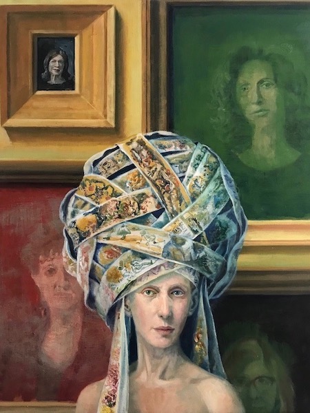 In another, entitled Self Portrait with Anna, Kathe, Liz and Barbara, (whose portraits loom behind her) the balled-up scroll sits atop Heffernan’s head like a majestic turban. In its brazen power grab of not only the male gaze, but male art history and male politics, Hunter Gatherer (which, in effect, reverses those roles) might more aptly have been called “Female Empowerment.”