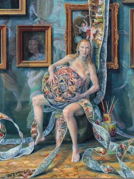 The painting that originated Heffernan’s use of the scroll is Self Portrait with Daughters. This visual homage to literary heroines features Heffernan center stage, the scroll covering most of her nudity. Surrounding her are portraits of George Sand, George Eliot, Charlotte Bronte, Louisa May Alcott, Willa Cather, and for currency, contemporary powerhouses Meryl Streep, Carolee Schneemann, Joni Mitchell, Nina Simone and Gloria Steinem. Ruben’s Rape of the Daughters of Leucippus is directly behind her. Here Heffernan has the male would-be abductor on horseback as a naked woman who is aiding the daughters’ escape.