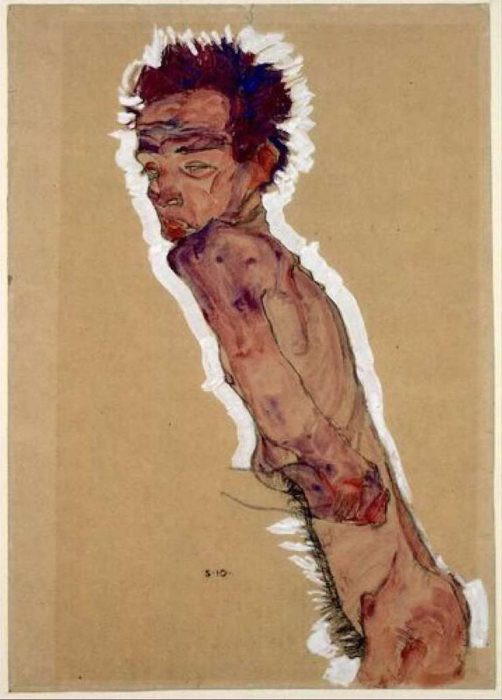 Why does the suffering communicated in this work seem to have such a clear sexual component or etiology? Partly it is Schiele’s decision, which here seems almost like a compulsion, to display himself in the nude. This is plainly not a gesture of candor or innocence, but the reverse: Schiele clutches his arm to his torso in a pose reminiscent of Adam feeling shame about his nudity for the first time. (Arms, in Schiele, are frequently put in the service of expressive distortion and contortion.) His face is deeply expressive of a disgust that can only be self-disgust; his clamped lips seem to be trying to get rid of a bad taste.