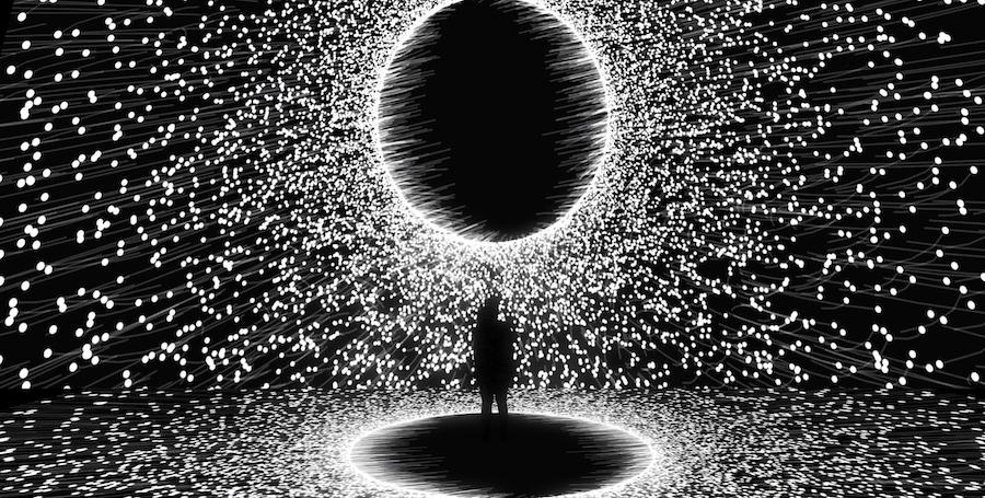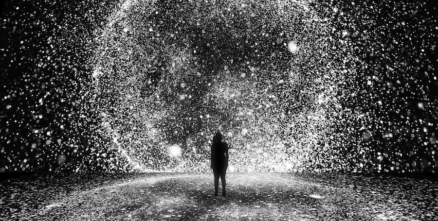 So does the Atelier des Lumières show. Located in an unlikely neighborhood, where people live and go out, and which was the target of the terrorist attacks of November 2016, the venue welcomes with its first show a public that is more varied than at a regular exhibition. Bruno Monnier, President of Culturespaces proclaims: “The passive observation of works of art is no longer relevant, and I’m convinced that people are increasingly learning about art through this immersive experience and the emotions they generate. The marriage of art and digital technology is, in my opinion, the future of the dissemination of art among future generations, as it is able to reach a younger and wider audience than that of the traditional museums.” After the Austrian show is over, it is followed by something quite different. The short program, entitled Poetic_Artificial_Intelligence, covers the walls with words that, again, multiply, strobe, tessellate. They zoom up, they zoom down, they create dramatic symmetries. Made from scratch, rather than using existing imagery, the piece comes across as more creative than the iconorrhea we have just witnessed. Yes, that is a neologism, from ‘icon’, the image, and ‘rrhea’, the flow. The lines of words, then the abstract patterns of light create satisfying geometries. Here, the algorithms manipulate light as its source material, rather than images and colors. We forget that we are still bombarded by information to enjoy the immersion in a weightless universe that scintillates. It is as if we witness the initial Big Bang and the resulting cosmos sprinkled with shooting stars and Milky Ways. This imaginative celebration of the demiurgic by OUCHHH, an international creative collective, comes across as a piece of contemporary art in itself, while the programs about the artists belong to moneymaking pop culture. And whether that is art or not is a long discussion.