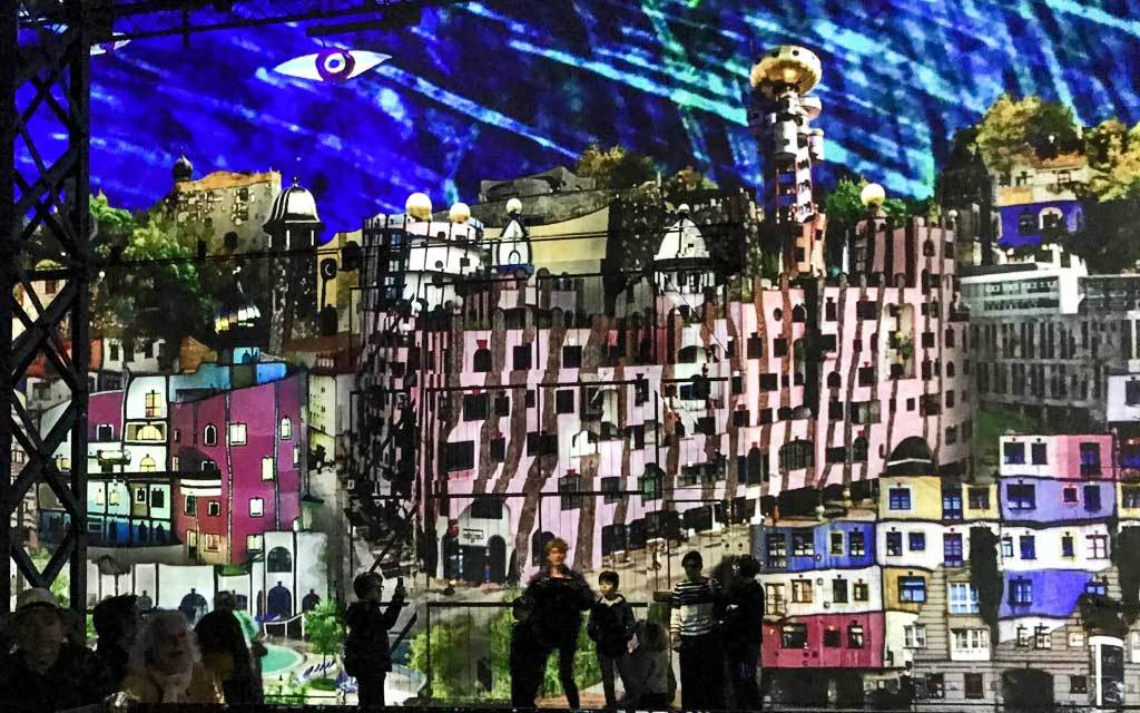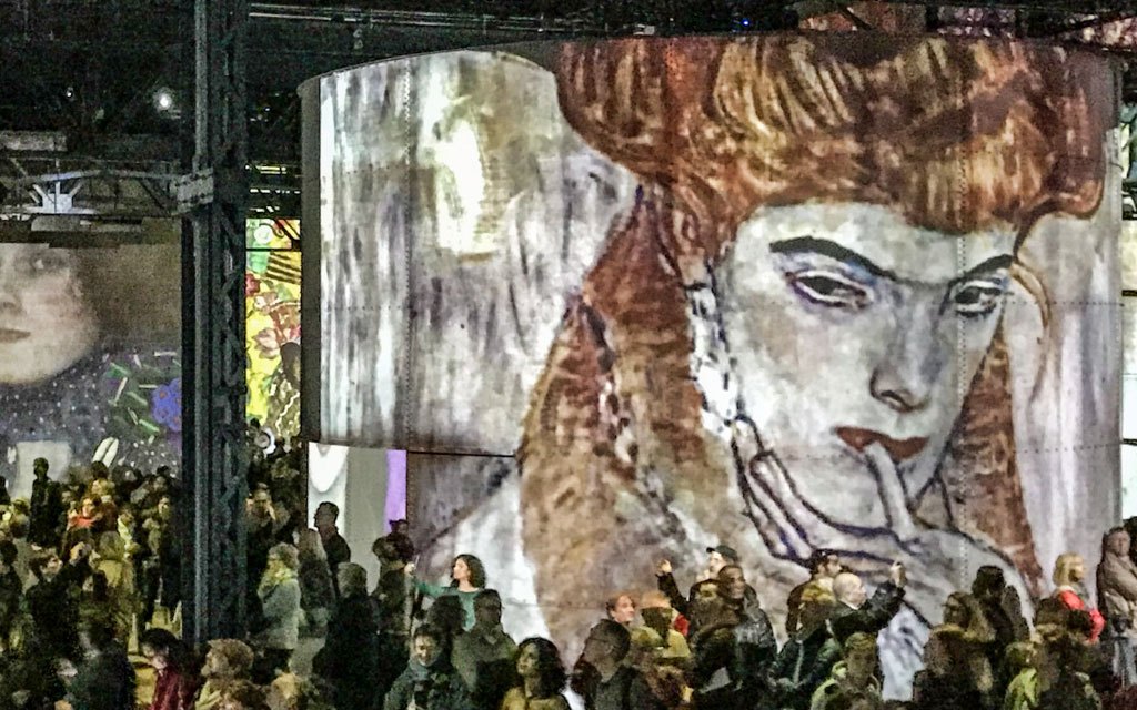 There is nothing erotic about Hundertwasser, but he was a simpatico human, probably more so than Klimt and Schiele. His values marched way ahead of his times: anti consumerism, anti capitalism, anti conformism, pro ecology. Most art historians would not deem him a major artist, but an agreeable cross between a designer, an illustrator and an architect. In fact, his Hunderwasserhaus in Vienna competes with the 19thcentury palaces by attracting millions of visitors. The simple, colorful shapes he favored match nicely the geometric structures inside the Atelier des Lumières. Trains, boats, houses multiply joyously on top of each other, chugging, blinking, tooting. Colors are primary, faces primitive. His work, and this part of the show, is bound to appeal most to children under the age of 8. Friedrich Stowasser (1928-2000) took as his artist’s name Friedensreich Regentag Dunkelbunt Hundertwasser, or Empire-of-Peace Rainy-Day Dark-Multicolored OneHundredWater. He must have had a sense of humor. Gustav Klimt (1862-1918) showed no sign of a sense of humor in his work. But he was generous. He mentored by providing models and patrons as well as constant encouragements to young Egon Schiele (1890-1918).