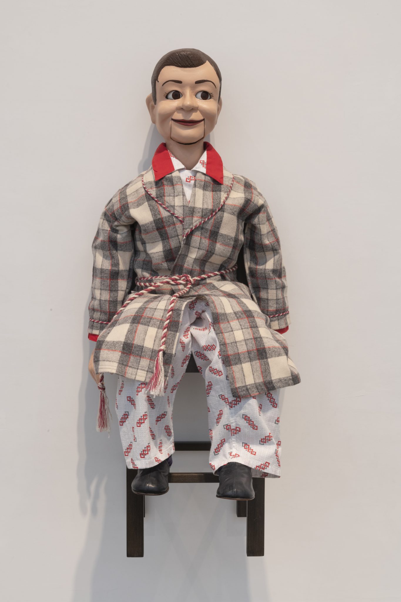 Simmons played with larger dolls in the 1990s, cleverly dressing wide-eyed male resin models of actual Howdy-Doodyish ventriloquist dummies in vintage boys’ clothing and taking photographs of them in simulated situations. What did such boy-men fantasize about? Menage a trois? masculine muscles and derrieres? barbecued chicken?
