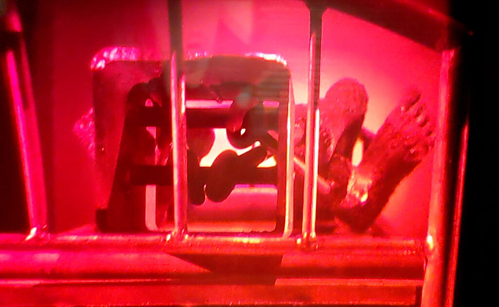At first, the holograms look like framed, dull, solid, blood-red rectangles. The images are not visible from every angle. But when you move to the sweet spot for each hologram, an eerie space pops inward, complete with small furniture, stairs, or walls. There is so much dimension and detail that they seem uncanny. The images come and go in shades of red, at once ghostly and crisp. At times, glare and reflections obscure these little floating spaces, making you aware, once again, that it is all an illusion – nothing but flat glass.