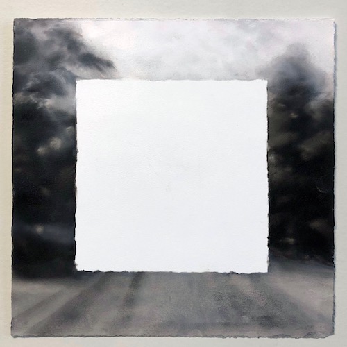 More ethereal is her 2019 Untitled (arroyo). This painting gives us a view of trees that are carefully delineated; we see them as separate entities rather than forest. The scene is a captured moment, a moment’s rest from a hike in the woods. The trees are watchful and waiting. They seem to ask what will the person watching them bring? If the trees offer shelter and shade and rest, will the person viewing the scene appreciate that peacefulness, or shatter it?