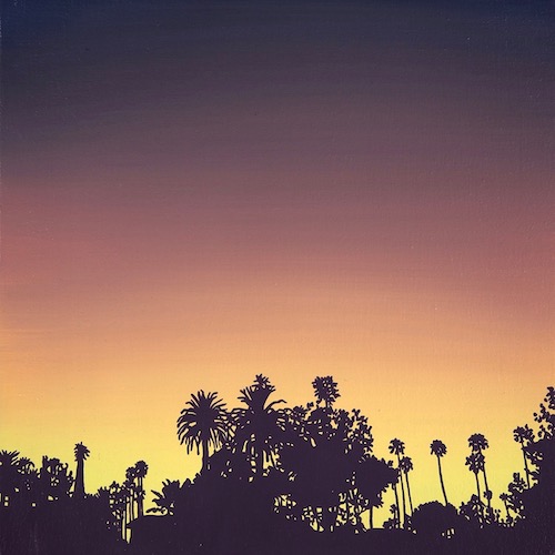 In Venice Twilight, a radiant painting that reveals a section of the Venice skyline, the central structure highlights windows that reflect the coming sunset, embraced by a semi-circle of seven palms. Other city skyline paintings feature only a few distant trees; in one, Inglewood Sunset, a plane soars overhead in a patch of blue above the gold and orange sunset, while billboards and the curved poles of streetlights serve as stand-ins for plant life. Palms and other trees cluster again, pure silhouettes, in the glowing sunset hovering over Hollywood Forever.