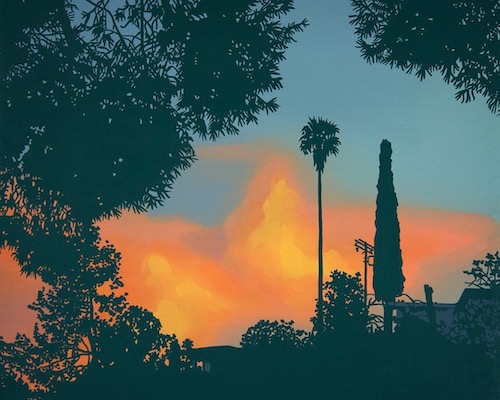 Warren has created vibrant oil-on-canvas works that fully embrace the film-industry-coined description of the “Magic Hour,” that brief time when the blue sky goes gold before fading into an overripe sunset. Her images are stylistically heightened photorealism, depicting buildings and traffic lights, palm trees and street scenes, all under near-twilight and ever-glowing skies. The views represent a time that seems to be an eternal summer, a narrative California dream constructed from landscape. Warren tells her story of the city, capturing its architecture, flora and fauna, and above all the quality of its sky — of day on the edge of transition into night.