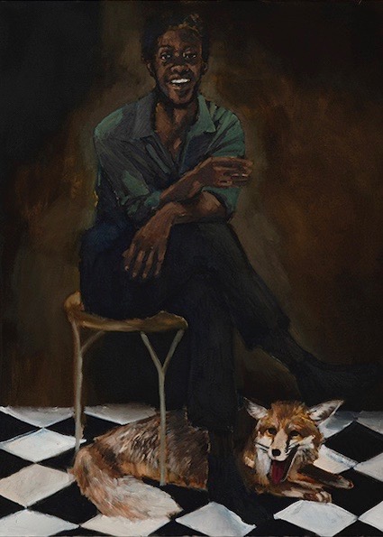 An English artist of Ghanaian descent is expected to honor her heritage, and she seems to have paid heed to it earlier on in her career, when her paintings leaned toward a kind of grotesque form of folk art. Now there is an affirmation that she will paint what the hell she wants. While her subjects come across as tortured, the paintings themselves reveal a lusty enjoyment of painting, of controlling the matter. The compositions, assured, dramatic, draw all the focus to the subjects by confining them tightly inside their frame, or by suppressing context. Animals make an appearance, but they seem to define the sitter more as an ironical contrast then as a clue to their identity. A light colored owl has just landed, while the man seems to back off, awed by the bird’s ability to fly [The Ever Exacting Man]. A parrot outstages the sitter with his flamboyant feathers, a cousin of Flaubert’s mythical creature. A gentle irony seeps also in the depiction of her subjects’ intense expressions. All this inner life sprouts out of the depth of their souls, but few are actually doing anything. In a painting with four dancers [A Concentration], only one is actually moving, and his figure is clipped by the frame, a compositional feature favored by Degas. The 19th century sitters were also doing nothing, but the artists were aiming at representing the personality of an actual individual. The content in her work consists in the longing she sees around her, or that she feels herself. If her creatures express torment, she seems to make her mark with little creative anguish. Her visual style derives from an art movement that most gallery visitors have interiorized as a sure value. It will keep them well within their comfort zone, demanding no leap in their appreciation, no embracing curve. Her work, which has been honored with major awards, and welcome at the various temples of art, would have found no place at the Salon des Refusés.