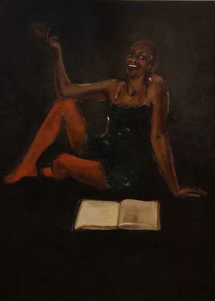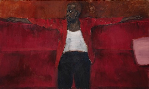 Yiadom-Boakye also paints ballerine and ballerini, with the same delectation for the rendering of the bodies and the fabrics. But these people, instead of being objectified, think, and feel, and question, and express themselves artistically. The sitters, dancers or others, show a sensuality that eschews sexual titillation. If they seduce, if they are seduced, it is through their whole person, body and soul. She does not paint close portraits. The large paintings are all en pied, or at least down to the waist. The heads, which are typically large in relation to the frail bodies, seem heavy to carry. The eyes stick out of muddy faces, more precise, as those of an African sculpture, the whites stressed unnaturally. These eyes look at us, look us back in the eyes as we look at them, denying us any voyeuristic indulgence. These young people long for something lacking in their life, in lieu of a louder love, and address that quest to us, with directedness. Their appeal denies us the numbness to strangers that is part of our social vocabulary. The bodies seem to partake of the anguish: they’re skinny, twisted, angular.