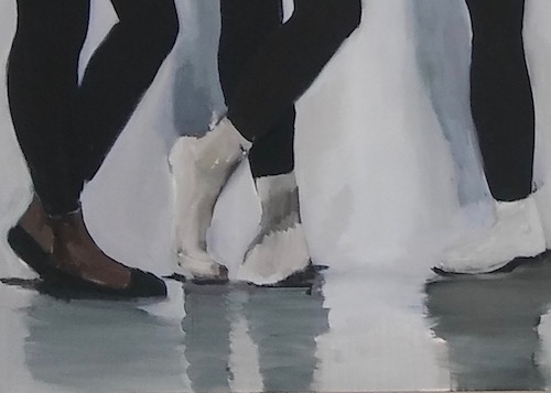 The two largest paintings in Yiadom-Boakye’s show, “Les Corbeaux,” commanding a whole wall, depict the same man, or doppelgängers. Their squatting form is boxed by a nearly square frame. Her title denotes an affectionate irony, as if her subjects had the innocence of birds, and their slight ridicule in claiming dignity. Manet did paint “The Raven (Le Corbeau)” for a print of a French edition of Poe’s “The Raven.” However, Yiadom-Boakye’s French title is more likely to refer to the raven blacks dressing both men. Her enjoyment at creating mystery and depth with her blacks, at bringing out the light, the silkiness of the whites, is palpable. French peppers the titles, fleshing out meaning in individual works, and the poem that prefaces the exhibition (see below) further builds on those meanings, broadens them and brings greater understanding to this intimate collection on the whole. The visual quotations speak loud, too: here are Degas’ reflections of ballerinas’ feet on the wooden floor: