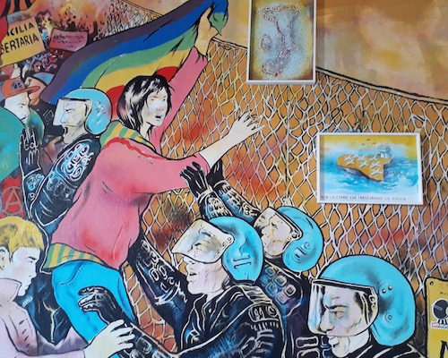 Manifesta 12 assigned itself the mission to leave Palermo a better city, and to empower its people. Curators made a conscious choice to hold events in spaces that are not usually dedicated to contemporary art: gardens and parks, churches, abandoned Palazzi, housing complexes, a refugee center. Most of the sites are within city limits, but a few — a scout base, the Pizzo Sella ghost housing development, Gilles Clément’s garden in the ZEN housing project – are a few hours away by foot, less by car, as kindly indicated in the Biennial’s guide. Each location gets a detailed description, on the same footing as the work exhibited. Casa del Mutilato (Center for the War Wounded), a fascistic era building, displays bombastic columns, metal eagles and 30s murals to the glory of war and soldiers. Its main space hosts a video triptych, Unending Lightning, by Cristina Lucas. Civil casualties statistics, archival footage and photographs log every single bombing since 1945, and the sum total is devastating. An embroidered silk tapestry maps World War II bombings in Europe. Another video, projected near framed photos from the fascist era, follows a plane pulling a banner of “L =(1/20 d v2 s L),” the formula which enabled flying. Because of its military related purpose, the whole venue becomes an installation where the work dialogues with the surroundings, delivering with poignancy the absurd cost of war. This exhibit belongs to the “Out of Control Room” theme, one of three that inform the Biennial, while the “Garden of Flows” section offers solutions to rein the world back into harmony. Works with the theme, “City On Stage,” investigate Palermo and simultaneously make propositions for an enlightened future. Palazzo Forcella de Seta and Palazzo Ajutamicristo (literally Help Me Christ) also host exhibits that denounce our “Out of Control Room.” In the Palazzo Ajutamicristo, yet another grand dilapidated building, it’s unclear whether the graffiti was contributed by the artists on show or existed before .