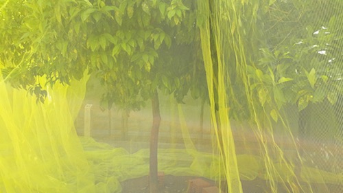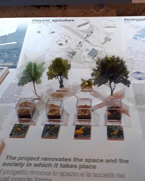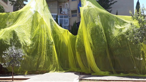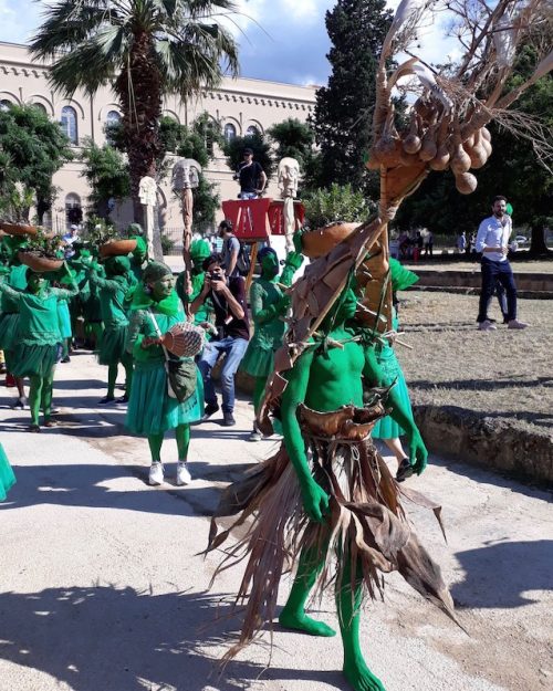In the busy center, activists give out information about a march from Sicily to Brussels to protest the treatment of refugees. They seem to have no direct affiliation with Manifesta 12 but nevertheless fit nicely in its nest. On the same street, a line has formed in front of a church’s porch. Those who make it to the front of the line get to peek through an octagonal glass window. Inside, mysterious poster boards, their content undecipherable from the peephole, line both sides of the center aisle. No Manifesta signage or posters identify the site. The peepers, mostly Palermitani, explain their interest by the fact that the church is usually boarded up. On the wall of a townhouse, a large canvas shows a man stranded at the top of an escalator: he is surrounded by wilderness. No signs here either, but there is little doubt the piece is part of Manifesta 12, and should belong to the “City on Stage.” A small public garden right in the busy center of town, Il Giardino dei Giusti, prides itself in its elegant antique ruins. With its citrus trees covered in yellow netting, this installation brings attention their precious beauty and complexity, created by that most excellent artist, Nature. At the same time, the netting turns the trees into ghostly figures, hinting at their fragility. Adding one more layer of meaning, a text informs us that the netting retains humidity while allowing the sunlight through. This results in a lesser need to water, a resource that has been fought-over heatedly in Sicily, as in other parts of the world. It is one element in the What is Above Is What Is Below intervention by artists Daniel Fernandez Pascual and Alon Schwabe. Whimsical and pragmatic at the same time, they have put together a “CLIMAVORE” bag with drought resistant ingredients that is offered for free in a number of locations. On a vast piazza, a bus all decorated in vegetal patterns has been revamped to host an education hub. In front of the bus, in the balmy spring weather, the two artists propose dramatic cooking lessons, with unusual vegetables, and large, mythical pots. These, as well as the workshops for children, are well attended.