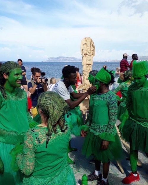 Nearby, as the sun sets on the stunning gulf of Palermo, people gather at the Foro Italico Park, right next to the sea. A European woman dabs green paint on a young African man’s face, both dressed in green. In fact, the whole group is wearing green, with every skin surface in the process of getting painted too. Once all the participants are transformed, the color of their skins cannot be told apart. Age and gender, too, become irrelevant. A man picks up a large carved statue, and other participants lift more figurines or baskets carrying plants. The happening makes for a striking effect, the altered human figure bringing to mind diverse branches of mythology, while the mood is both solemn and joyous amongst the participants. As the procession moves toward the center of the city, it gathers more and more followers. Local gawkers from a working class neighborhood whisper: “What is happening? What is this? “This” is a reinvention, commissioned by Manifesta, of the famous procession of Santa Rosalia, the patron saint of the city, which takes place every summer. This version, entitled Festino della Terra (The Earth’s Banquet), has been conceived by Jelili Atiku, from Nigeria, and inspired by Yoruba customs and the myth of the Green Man. The locals approve, mouthing “multicultural.” They profess to have no problems with the influx of immigrants to Sicily. “These people were hungry in their country,” says a man pinching a comfortable paunch. “Many Sicilians had to emigrate too,” adds an elderly woman with stunning blue eyes. They know very little about Manifesta, and don’t seem too interested. Meanwhile the procession reaches the center busy with tourists and shoppers, its leader blessing various landmarks along the way with a final ceremony at the Palazzo Costantino, another abandoned palace.