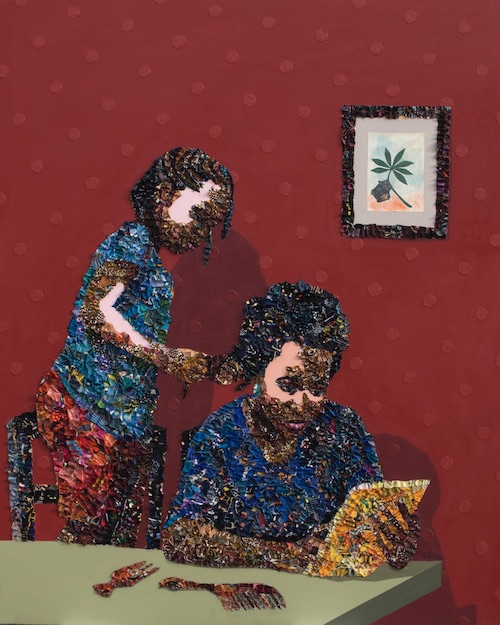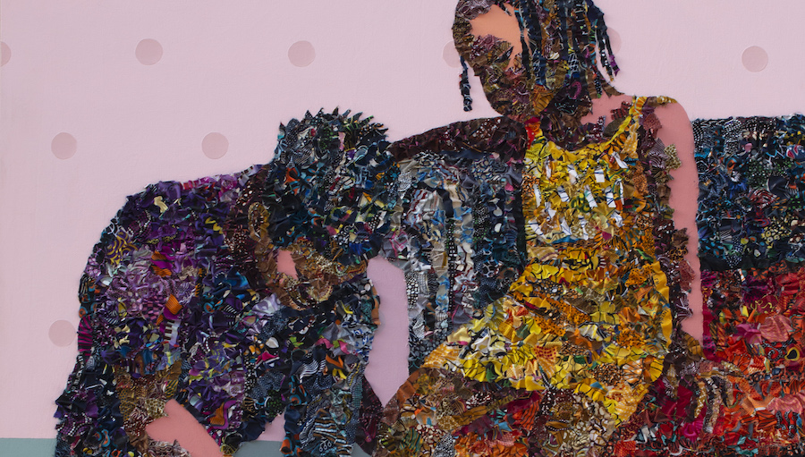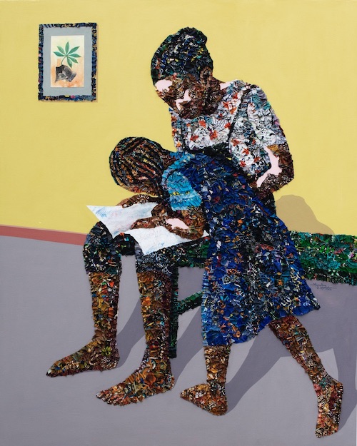 The colorful fabric Akpojotor uses in these paintings echoes the complexity of human experience, and the shifting memories as we move through our lives. It’s as though each color represents a singular moment, and when put together our lives become a tapestry of lived experience. Akpojotor represents a range of childhood experience from riding a bicycle for the first time to reading a book and braiding hair. While these acts may appear simple and altogether uneventful on the surface, Akpojotor suggests that through these seemingly simple life events, children learn to navigate the world with self-confidence, persuasiveness and patience. After all, the greatest gift we can give a child is to allow them to flourish on their own terms.
