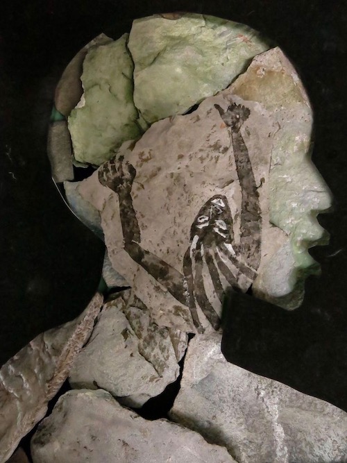 Small paintings on shale-like stone work well enough on their own, but on a shelf together they set out her vocabulary and a single natural history. The figures in black or white include birds, reptiles, primates, and humans – or an evolutionary stage in between. A man and woman, huddled together on canvas, have not altogether lost their fur. Stone fragments turn up in the larger paintings, too, along with additional strips of canvas, for a layering of materials and thoughts. Wavy incisions into thick white bring out the texture of paint, but also the material weight of art itself or that sky. With a predominance of red, the air may have caught on fire as well.