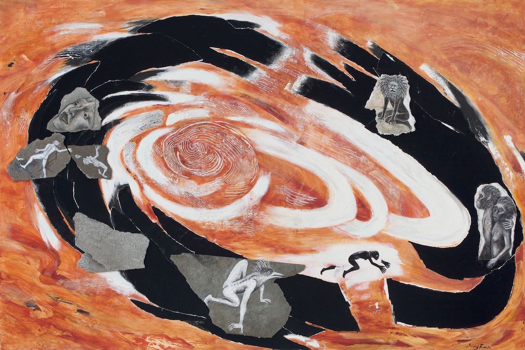 Frank keeps repeating the same motifs because she is actively forging a vision. That gray flesh picks up the tone of the slate on which she paints. Her most ambitious painting here brings her motifs together in those fragments of gray against that fiery red and swirling incised white. The figures to every side may not acknowledge one another, but they belong to a single circumferential swirl as well. Their often prehistoric nature links her natural history to something older than herself or Modernism. Still, like an unplowed field for Burchfield, it unfolds within a present-day imagining, where neither she nor her subject can let go.