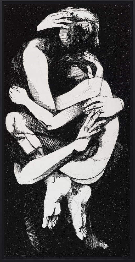 The motion – caught precisely, a profound recreation not just of movement but of the act of being alive – which these works have is astonishing; all the more so for their monochromatic palette and the wild, consuming nature of the acts which Schnapf has frozen in time. The largeness of their scale renders them even more compelling; the artist’s use of line, his perfection of the human body, its mobility, and the meaning that seems to slip from our very limbs, is exquisite. Both the intensity and the somewhat enigmatic nature of the artist’s work draw the viewer into the world in which his people live; we want to understand their emotions, what is happening between or within them.