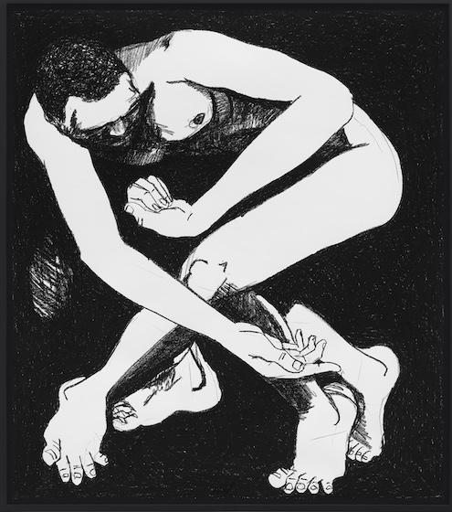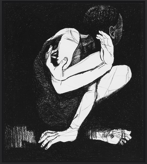 The physicality of the works, their spareness and their grace are all beautiful; the individual strength of each piece is the mysterious quality of the dark backgrounds and white figures, as if they were players moving across a darkened stage – the stage of life. With a piece such as Stars so Bright, a contorted male figure is bent in a kind of ballet with another hidden figure – save for the masculine feet – positioned behind him. With You have the chance to be more beautiful than you’ve ever been, a man and a woman are inextricably intertwined, bound together in a dance of love-making and love. The woman’s head is thrown back, as if in ecstasy, their hands linked together, bodies pressed together, her figure tightly against his in a seated position. Equally bound, ecstatic, and passionate is Perhaps you think you might fall away. The smaller figure here is cradled, held, pressed up against the larger; both have faces obscured. In contrast, there is anger, perhaps subjugation in the wrestling-like positions of Hairpin Turn. It is difficult to tell the true import behind Sometimes a sapphire, but the viewer is struck by the bowed and bent positioning, the figurative elements in crosshatched shadows, the mystery in the capture of a human being in an almost-impossible pose.
