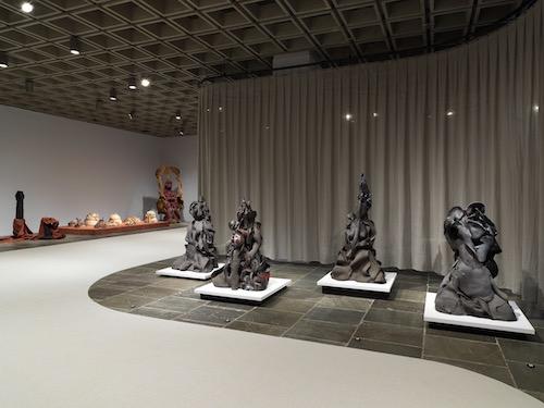 To the right, through September 29, her art unfolds chronologically, but one might do well to turn instead to the left for a living theater. A space directly behind the curtain might serve as a late-career survey all by itself, with work from 1996 until her death in 2015. It includes all three of her chosen media — dyed fiber, ceramics, and bronze with a patina close to gilding. There is no telling what holds up the knotted rope, in the shape of gods or humans. There is no telling, too, whether the rest represent sacred vessels, vegetation, savagery, or fossils. Mukherjee named the earliest sculpture here in Sanskrit, after a goddess of the woods, and the entire space might represent an enchanted forest.