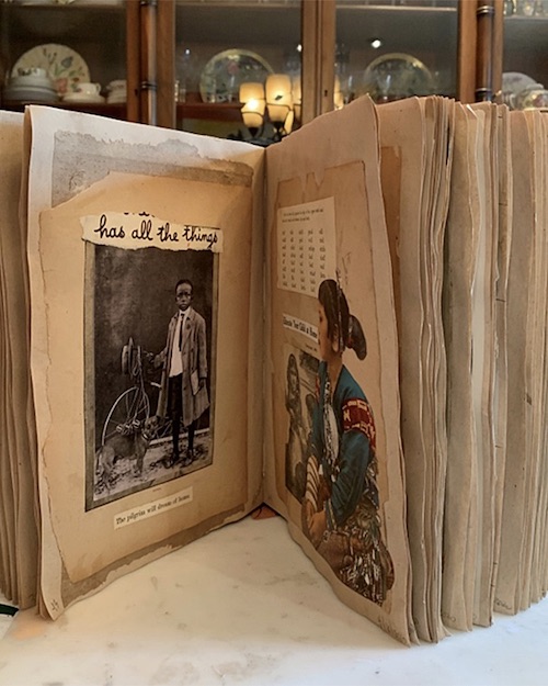 The collages contain fragments of old magazines, letters, family photos, maps, and bits of handwritten notes. Every element has meaning, but ripped from their original context as they are, you have to create your own stories out of them. You get the sense of watching the world from afar in page after page of distant places or distant memories. It evokes life inside our houses during Covid. The images are present before you, but they refer to everything that is absent.
