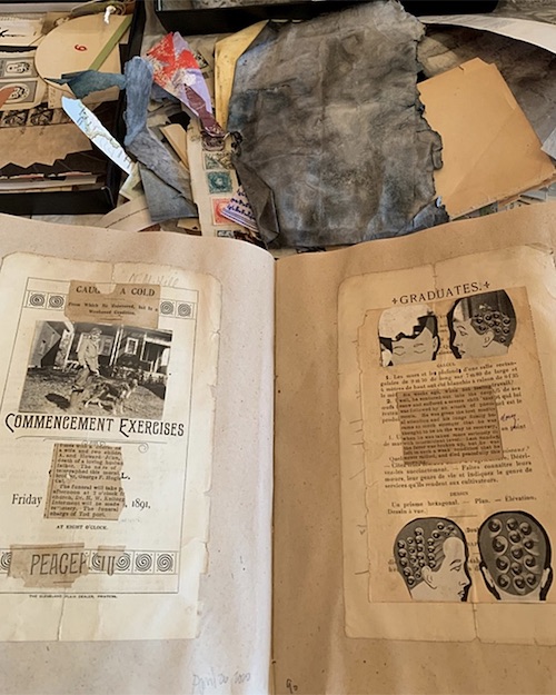 The entire book is like that. For example, on pages 89-90, Turner glued down several old fragments about having a mysterious cough and seeking new remedies, but it seems to apply also to the Covid era. There is also a casualty, a funeral announcement for a “father and loving husband.” The photos show the boxes of mementos from which Turner worked, intuitively and randomly, to create a new set of the lost and the found, of half-remembered events and lost memories.