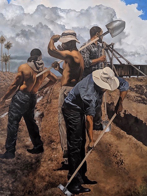 Shawn Michael Warren, with Abbot’s Waterway, 2019, oil on canvas, 82 x 62”, presents a realistically painted image of African-American workers who created the Venice canals and then due to racist policies were never able to live there. Historically, the image has its antecedents in the American and Mexican social and political murals of the 1930’s; however, visually without the wall text, the viewers might not understand the all-important backstory.