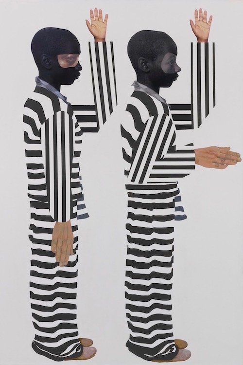 In I do solemnly swear ( Nessa Dorma Series), the two figures have the same face but one is darker in a reference to a photograph of O.J Simpson inTime magazine, which Roberts says was made darker “to look more devious and sinister.” The outstretched hand of one figure depicts Stinney’s oath to tell the truth in court — but he was not believed.