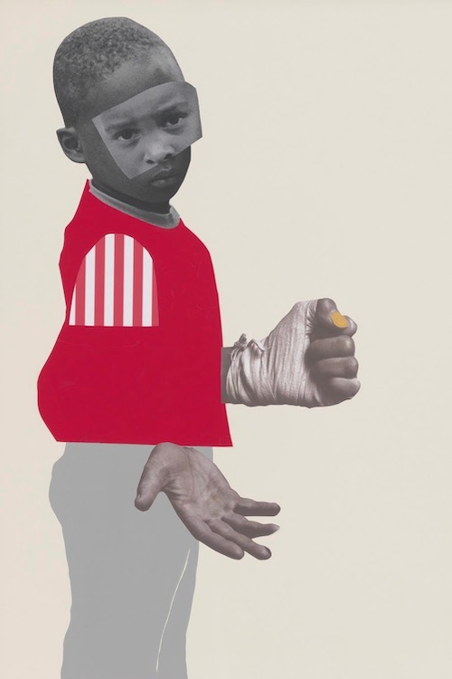 Roberts’ collages play on disproportion to emphasize the duality experienced by innocent Black boys who are mistaken for dangerous adults. She often enlarges the size of children’s heads: Ghost Gun; and hands: Speak. She also superimposes enlarged adult eyes on child faces: James Baldwin’s eye in The Sky is Open or Sidney Poitier’e eye in The Defiant One. In Ghost Gun, the boy with an enlarged head is a reference to Tamir Rice who was viewed as an 18-year-old when he was really only a 12. His yellow toy pellet gun is a ghost because it is not a real gun. The boy has a pacifier in his mouth as a signifier of a toddler .