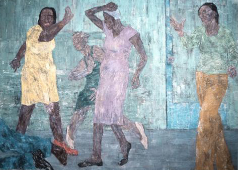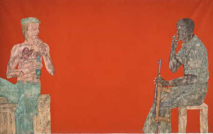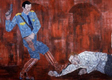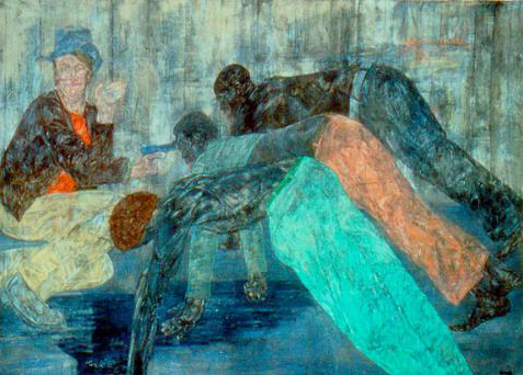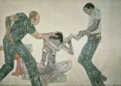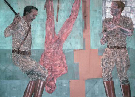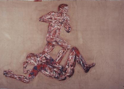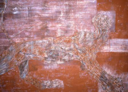 Entering into the room containing Leon Golub’s enormous (some as large as 120” x 198”) political paintings on raw, unstretched canvas is like walking straight into the heart of darkness. This grouping of narrative paintings ripped from news headlines in the 1980’s depicts brutal acts of real “terminators” on a vast killing spree during the Nicaraguan civil war. Golub’s intensely physical scraping of the surface makes the canvas into a metaphor for flayed flesh while the paint itself is vigorously ground into the very fabric, becoming one with it. Blood red and the dark rust color of dried blood permeate these paintings, which feel fresh and tragically current. These images of the sometimes smiling few torturing the many, guns to their heads, hanging naked upside down, are a ghastly reminder to us of the shocking prisoner abuse at Abu Ghraib prison during the Iraq war by our very own soldiers. Perhaps it is the fog of war that turns ordinary men into these avenging creatures. Golub seeks to remind us that, to paraphrase a familiar sixties counter-culture statement, “we are the people our parents warned us against.”