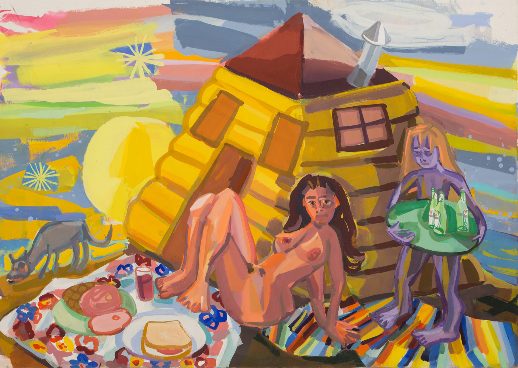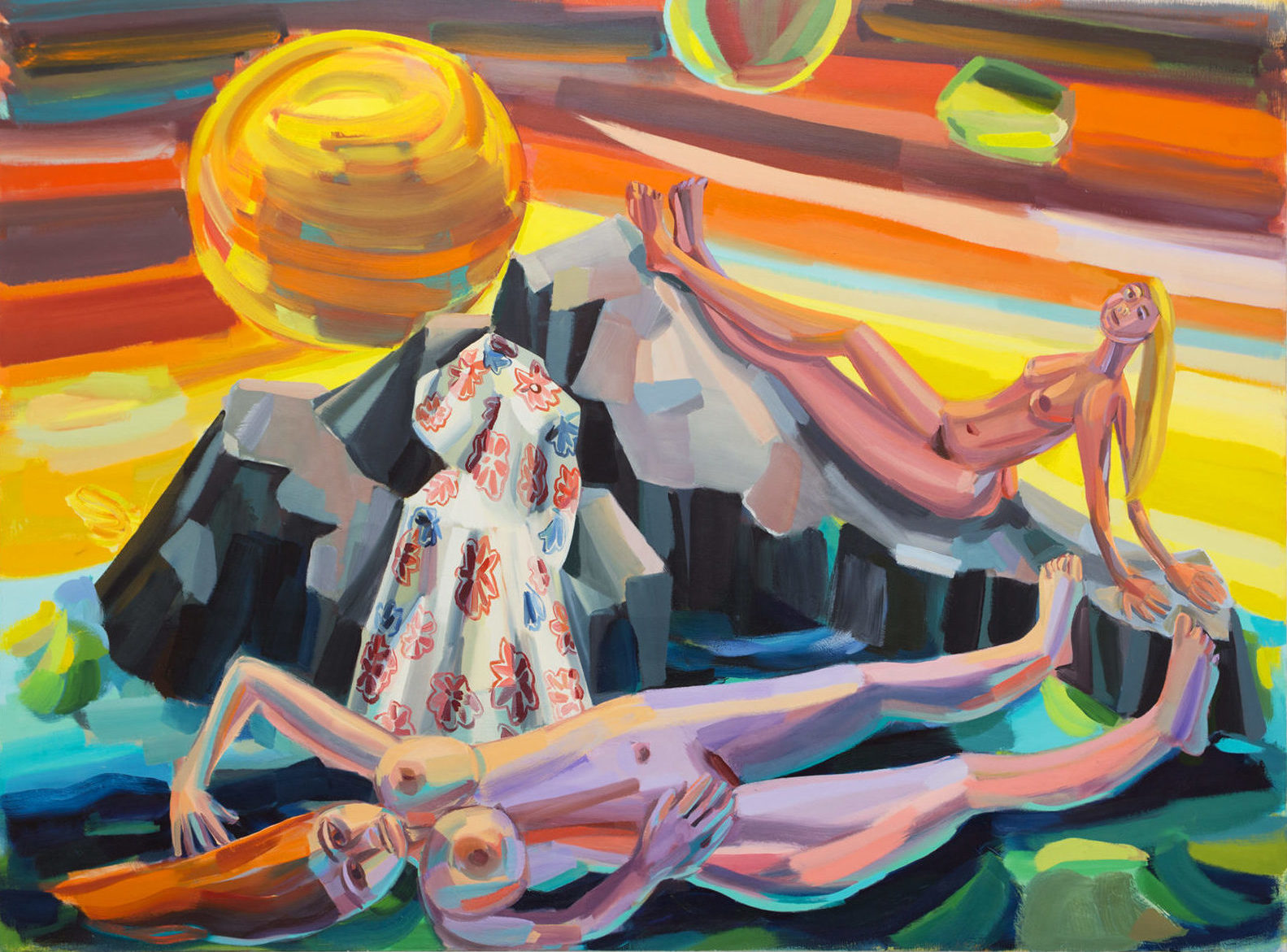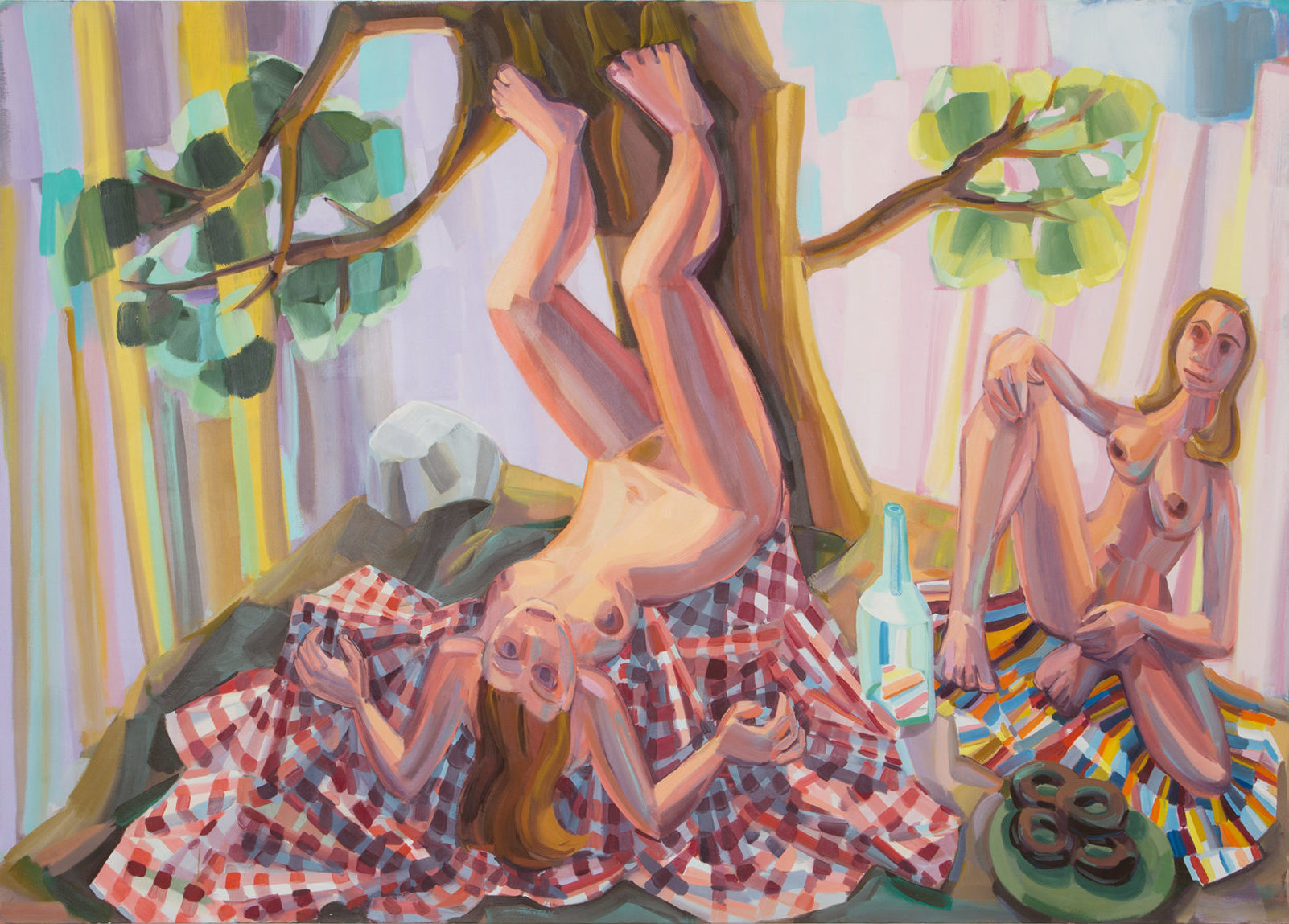 The Way She Goes to Town also showcases women enjoying leisure time by picnicking and reposing in nature. This act of pleasure and liberation, seen here in Cove (2012), Slope (2011), Picnic Rock (2008), and Lunch (2012), is actually a subversion of Édouard Manet’s iconic 1862 painting, Luncheon on the Grass. Set in the male-dominated world of 19th century Europe, Manet presents us with two fully clothed men sharing a picnic with a nude woman. The painting shocked Parisians of the day not because of its nudity, but because nude women up until this point had always been depicted as lovely, divine goddesses. The woman in Luncheon on the Grass, however, is definitely mortal, and possibly even a prostitute. In the absence of men, Linhares’s figures take that sense of divinity back. They seem to be realigning themselves with the sublime through their relationship to nature.