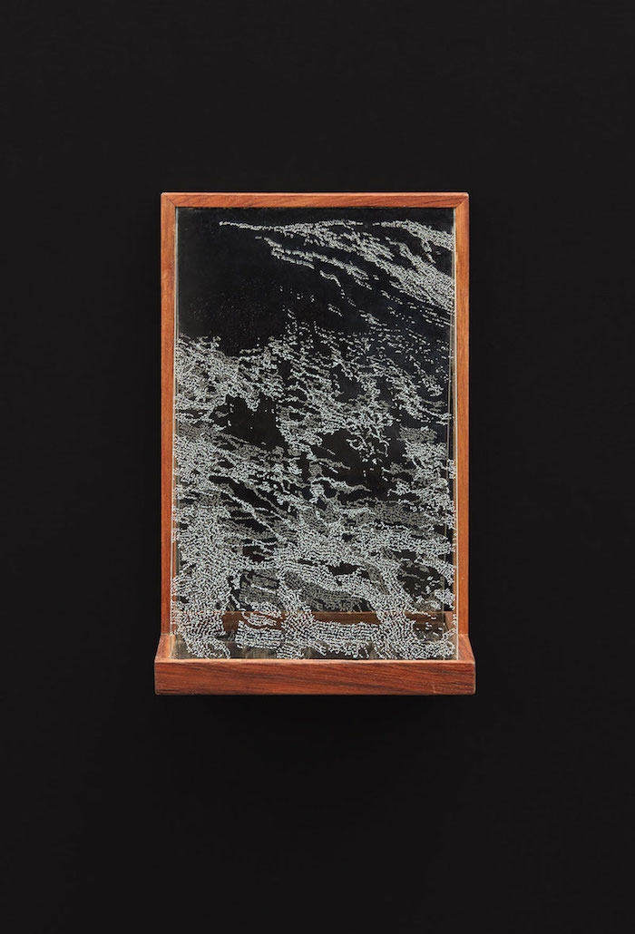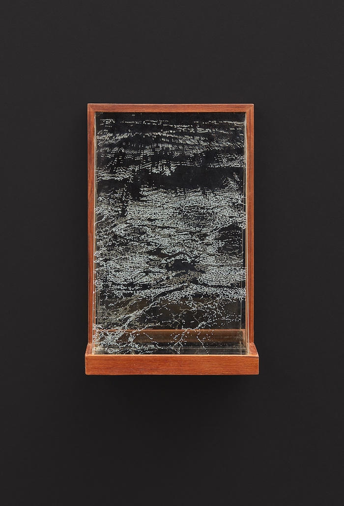 These drawings, which are not shown in the exhibit, were part of the artistic process from which Scacco made the glass etchings. The patterns were etched into 29 relatively small glass panels (roughly 12 x 8 inches) and then they were fitted to custom mirrored cabinets. Scacco used darker, bronze mirrors not only to reflect the worded water currents, thus creating the appearance and three dimensionality of rippling water, but also to darkly reflect us, the viewers, so that we are physically immersed in the art, in the water, and in the immigrant experience.