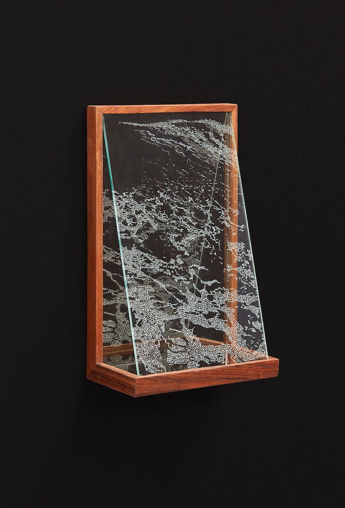 The Narrows features a variety of work united along the theme of immigration, politics, and power. The show is named after the water separating Brooklyn and Staten Island, which saw more than 12 million immigrants between 1892-1954. On the largest gallery wall, 29 etched glass sculptures hang, perfectly spaced, representing the 29 questions that were once featured on the immigrant entry exam. These are small, intricate pieces that are symbolic of Scacco’s ability to transform large and complex themes into powerfully, packed works of art that make an immersive experience for viewers.