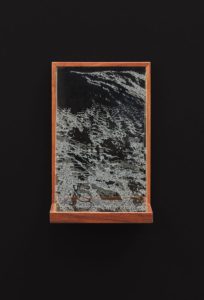 The last part of the show is in a quiet and dark back room. A looped video features footage of water passing beneath the boat on the journey from Ellis Island to Manhattan. The video is overlaid with archival audio of interviews from the Ellis Island Oral History Project, featuring the voices of immigrants who came through Ellis Island in the 1920s, recalling their momentous and sometimes harrowing journeys to the U.S. These are powerful and emotional reminders of both the cost of immigration on the traveler and their family, and of the toll of immigration on those who are excluded and separated from family now. The interviewees remind us of a history that is necessary, timely, and beyond relevant—of our nation’s immigration laws, policies and prejudices; of the architecture granting obstruction or entry in the U.S.; and more personally of the lives, loves, and locations people gave up to journey to an unknown place, often alone as outsiders, and of course, as dreamers.