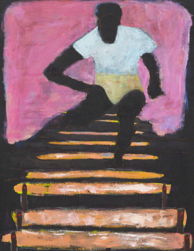Hodges’s paintings are not only recovered memories about growing up in Los Angeles, and then being an athlete, and then becoming a man and an artist, they are also memories of familial connection, or a way of thinking about connecting with family. In Big We’ll (2020) a little boy is taking off or trying to take off on his Big Wheel, while an adult man and woman stand nearby, protective and watching. The woman’s hand is resting on her hip: it’s a gesture that conveys so much about Black female being in a hostile world: my hand is resting on my hip for now, but that very hand can be in your mouth in a minute if you mess with this scene framed by innocence. The surrounding air is thick with possibility, warning, the remembered and felt concerns of Black parents, wonder. Perhaps the older man sees himself in that little boy, and in seeing that child take off into the world, there is so much he could say about its dangers—the older figure’s posture, like many of the men in Hodges’s stories, is a kind of shield and portal between that young person and the rest of the world—but now is the time for silence and watchfulness as the child, intent on discovering the universe for himself, takes off down a road to find his own wonder, and the school that will shelter him as he nourishes his own ideas about love, color, space, and the imagination.