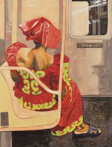 A personal favorite, Jordan Casteel’s Her Turn (slideshow), is a simply wonderful image of a woman in an elaborate traditional African red dress and hat, back turned to us, seated on the subway. The mystery of who the woman is and the subtlety of an image of someone simply out of view in an Instagram world, is visually riveting. The title is a riddle of sorts: the woman is turning away, she is taking her turn at privacy in an increasingly public world, or she may be ready to begin a journey and embrace a bold new world. Perhaps all three.