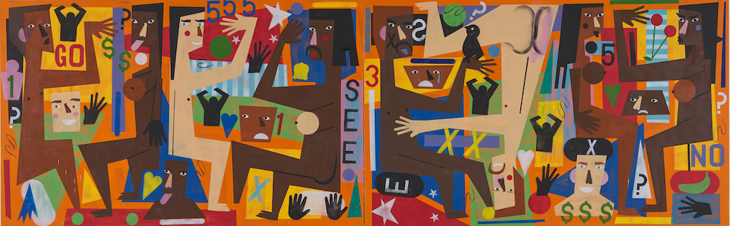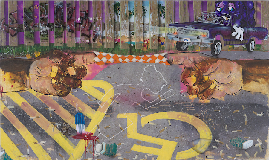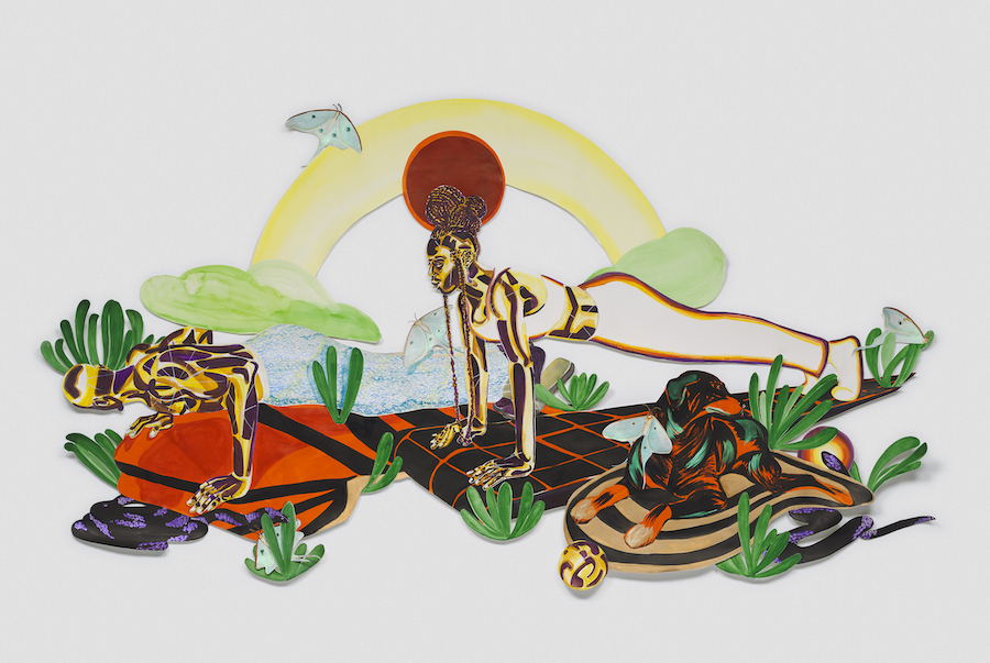 Curated by artist Nina Chanel Abney, Punch, at Jeffrey Deitch in mid-city, beautifully assaults the viewer with color, exciting shapes, and vibrant figuration. The current exhibition is an expansion of one presented at Deitch’s New York outpost last year; here the focus is primarily on LA-based artists, thirty-three in all — contemporary artists creating figurative and abstract connections with culture, society, and humanity.