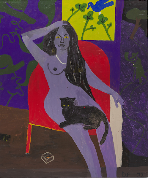 Equally impressive is Danny Fox’s Matisse-like acrylic le cauchemar (see slideshow), featuring a nude woman with a black cat on her lap and a blue bird out her window. The color palette, its shades of purple and green, the striking red chair, is astonishingly lovely.