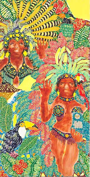 Koichi Sato’s two works, Life for Fun and Co-Existence (slideshow), both acrylic on canvas, are mosaic-like in approach, with jungle-like green and blazing yellow lushness surrounding the human subjects. The diversity of Co-Existence include the Statue of Liberty’s head; in Life for Fun a toucan watches two women in towering headdresses, evoking the spirit of a Brazilian Carnival, all of them plumed.