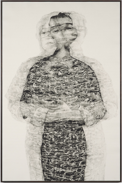 Two monochrome works mixing oil paint with graphite and rubber stamped letters blur the line between figurative and abstract in Kenturah Davis’ work on kozo paper (slideshow), both are recognizably human forms, with other, ghostly images around them.