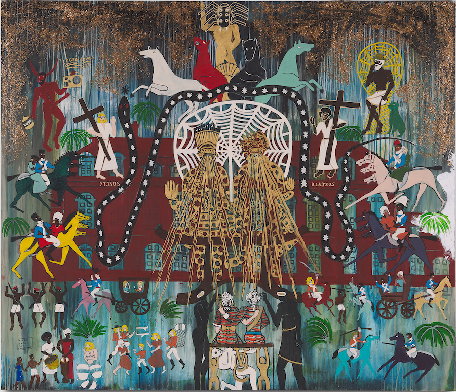 Devan Shimoyama’s lush Roses Are Falling is also dense, both texturally and visually. Created with oils, color pencils, sequins, collage, jewelry, denim, and Flashe, the work is pure magical realism. It literally dances with light and color, as alive and surreal as the image itself, of a man seated under a tree surrounded by roses falling from the sky.
