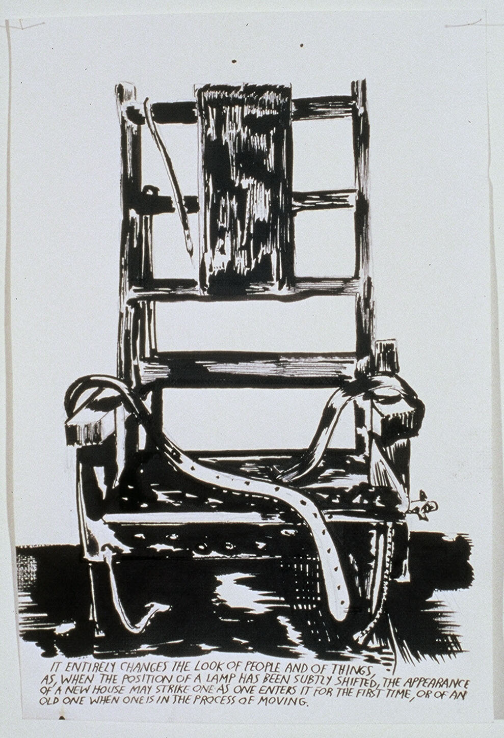 Pettibon’s work must be read as well as seen, which is to say that it must be interpreted, not merely viewed. It is possible, I suppose, to wander through the New Museum appreciating the soothing blue-greens of his surf scenes, or the austere all-blacks of the drawings derived from his zines, but “A Pen of All Work” requires and rewards patient reading. One does not appreciate these works so much as decipher them. This is part of their magic, for it is the words that open up the worlds of the works, giving them their humor as well as their heart. Pettibon’s text blocks also open up the works to the world beyond the institutional gallery walls, snatched as they are from sources as varied as TV movies, political punditry, and Proust.