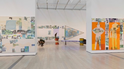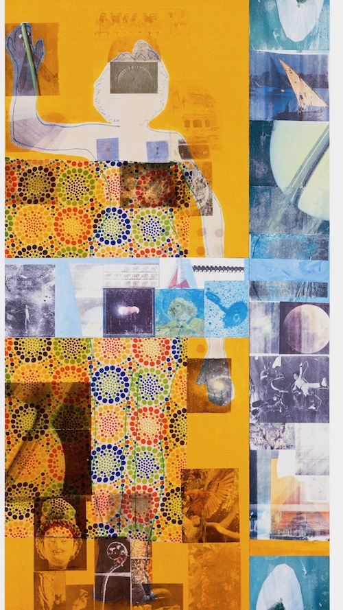 One of the simplest panels is a series with three red checked tablecloths seemingly floating through air, slightly wrinkled against a serene sky like expanse of color moving, left to right, from light yellow to tints of darkening blue. The red checked squares look like Op Art paintings themselves. The simplicity is striking after the jam-packed imagery of most of the images, with solvent and photo transfers, fabric and paint jostling for attention. There is even a large expanse of uninterrupted white, perhaps a nod to his own all-white paintings done at Black Mountain in 1951.