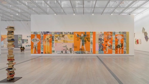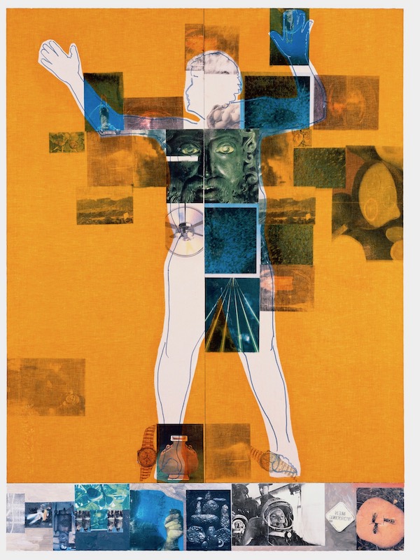 Run, don’t walk to see the revelatory exhibition entitled Rauschenberg: The ¼ Mile, at LACMA. The large-scale, enormously ambitious work shown here (together for the first time) as one long piece was done over seventeen years and is a joyful trip through Rauschenberg’s absolutely pristine craftsmanship, complex imagery and his many cultural touchstones. These works were started in 1981 when there was a Rauschenberg retrospective in Europe and clearly the artist is ruminating on his previous bodies of work such as his iconoclastic “Combines” from the fifties and sixties and his “Spreads” series from 1975-83.