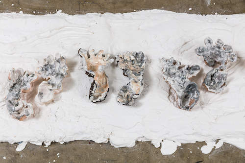 The animals gather in this garden, near hanging ceramic braids on the wall, and a beautiful painting indicative of both Farr’s style in general and this show specifically. This work, Promised Land I, ties in all of the colors and feelings of the show, welcoming viewers to enter the Judeo-Christian tale of the expulsion of Adam and Eve from Eden. In a living-room like setting, a plastered lamp and table suggest both Adam and Eve’s presence and absence at the same time. Is this the garden from which they were expelled or is this the domestic space they inherited via expulsion? Both options feel empty and hollow, yet also with the suggestion of hallowedness.