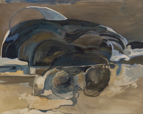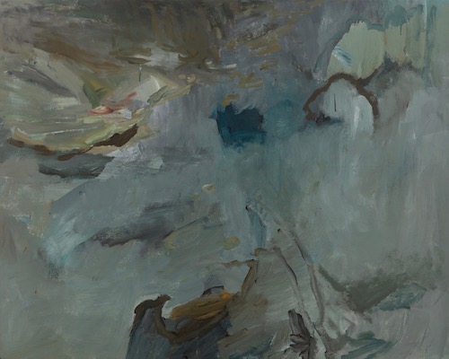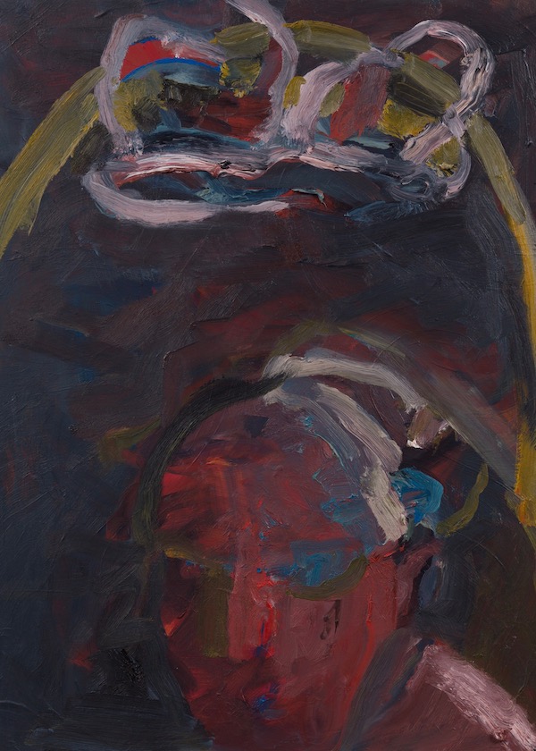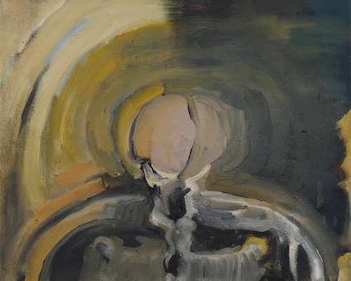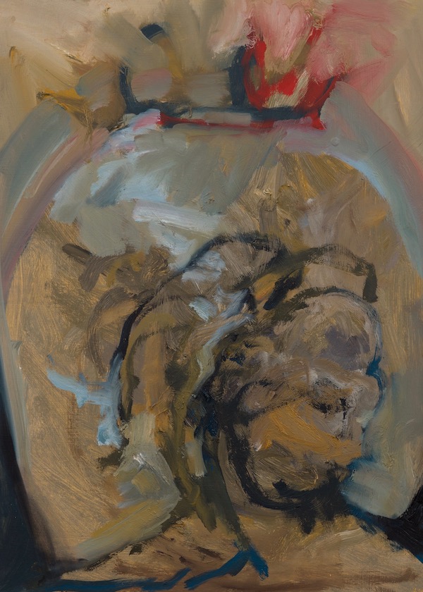 From Mary’s rooms, visitors enter into the space of the Last Supper. A large table with ceramic place settings greets us and thirteen ceramic pairs of footprints stand at the ground, quietly urging viewers to stand behind them and to look to the paintings on the other side of the table. These works reconsider the famous subject and imagery of the Last Supper itself. Farr’s paintings are a rewriting of the great (men) of art history. Paintings and subjects are slightly reminiscent of those painters Farr said she studied at this time, like Goya, Velasquez, Rembrandt, Titian, Bacon, Auerbach, Freud, Doig, and Turner. (She says of this process that she “did not want anything to be too heavily associated with a specific work,” but that “the old masters were a marinade.”)