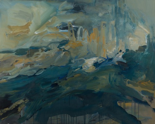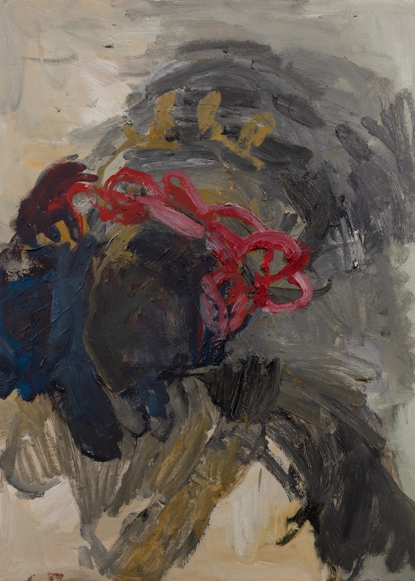 From Mary’s rooms, visitors enter into the space of the Last Supper. A large table with ceramic place settings greets us and thirteen ceramic pairs of footprints stand at the ground, quietly urging viewers to stand behind them and to look to the paintings on the other side of the table. These works reconsider the famous subject and imagery of the Last Supper itself. Farr’s paintings are a rewriting of the great (men) of art history. Paintings and subjects are slightly reminiscent of those painters Farr said she studied at this time, like Goya, Velasquez, Rembrandt, Titian, Bacon, Auerbach, Freud, Doig, and Turner. (She says of this process that she “did not want anything to be too heavily associated with a specific work,” but that “the old masters were a marinade.”)
