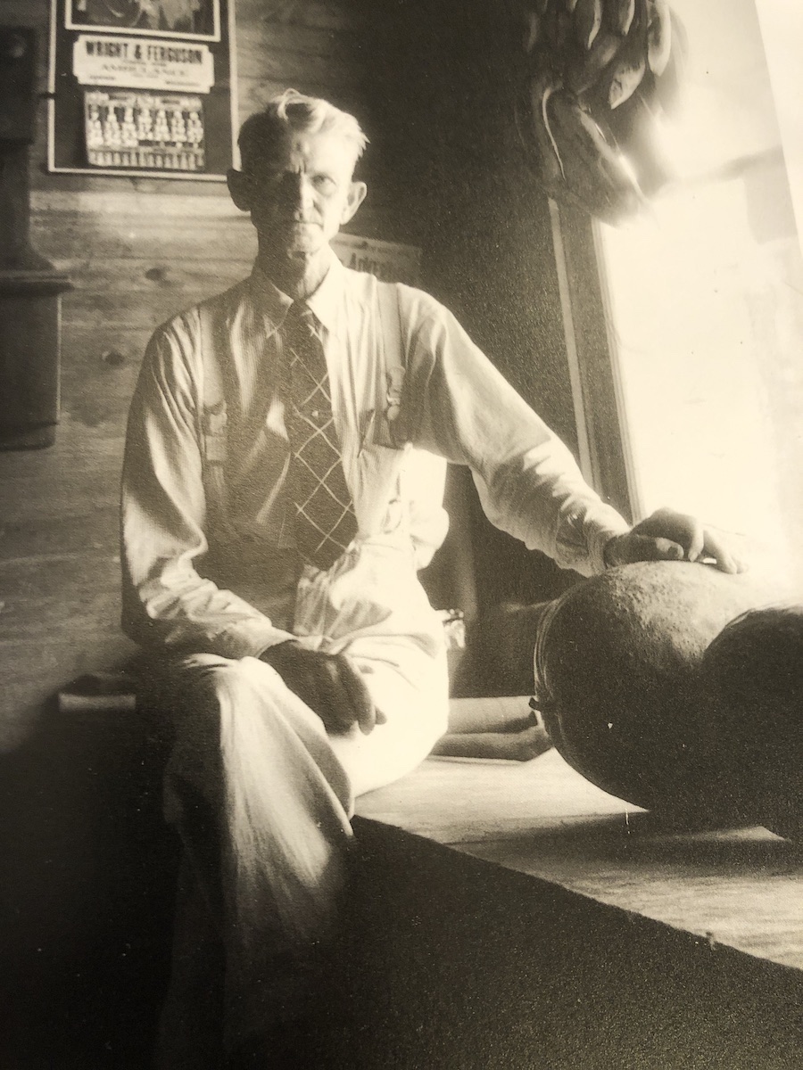 The other photo, the one on the right, is of a taut wisp of a white man about the same age. He also sits on a bench, but he’s inside a neatly kept shop in Rankin County, just down the road. A soft light enters a large window to his left. It illuminates the silky flip of white hair on the imposing forehead of a man whose posture declares: “country store owner.” He is dignified and stern, not elegant, but proud, sporting a tie knotted tight that contrasts with his counterpart’s flopped open collar. The white man sits upright and compact, legs firmly crossed, his right hand crossing over to rest on his left thigh. The other hand is on one of two melons that are also to the right of the frame. His icy eyes almost glare, his thin lips set tightly between ears so large, if they flapped, he might drift out the window. Behind him: a calendar, a phone; and to his left, above: a rack of ripe, fat bananas. He answers to no one but himself. The heritage he has inherited assures it. His hands hold that tension.