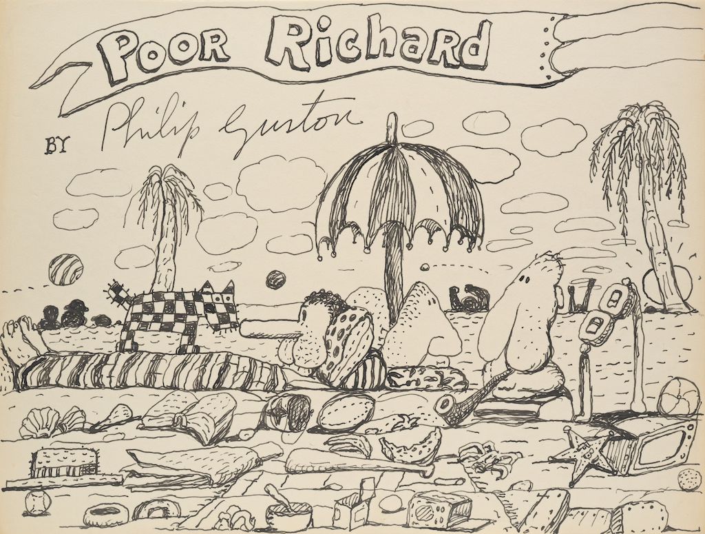 At this point, it’s instructive to revisit Guston’s life. His parents were immigrants. His father was a junkman collecting refuse, which was work he found to be humiliating. When Guston was around 12, his father hanged himself and it was Guston who found him. Later in his life, when drunk or depressed he would ask people, “Can you imagine how it feels to find your father like that?” A subterranean stream of sadness understandably permeates his work.