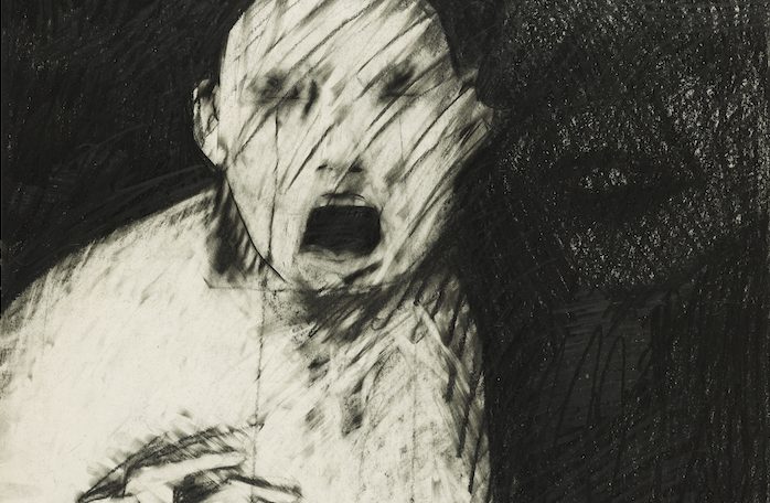 The exhibit is divided into three distinct but overlapping categories – Self, Dialogue, and Tradition. The “Self” area is the one viewers see first and it is a powerful introspective examination of Bartow’s demons. One of the earliest works, from 1979, is a stark monochromatic graphite on paper, large-scale drawing, entitled “Things You Know But Cannot Explain,” (from which the show derives its title), that portrays a ghostly bald figure, eyes shut tight, mouth agape in a silent scream, hand reaching out, with a hint of some figure in the background. This everyman, perhaps a stand-in for the artist, appears as a character in many of these large drawings. This portrayal is as unforgettable as it is hauntingly beautiful. Here Bartow wields an eraser with the same force and elegance as he does with black pastel and graphite, creating a dense, palimpsest surface, seething with energy.